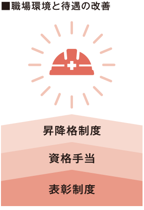 組織風土の改革を通じて、会社の業績向上と従業員の働きがい・誇りにつなげるため、昇降格制度、資格手当、表彰制度の拡充や、職場環境と待遇改善を行い、従業員のエンゲージメントを高めていきます。