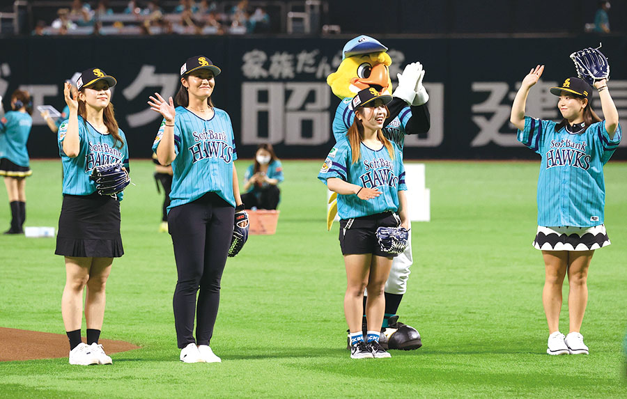 7月16日(日)、当社所属プロ4名(渡邉彩香プロ、田村亜矢プロ、佐久間朱莉プロ、後藤未有プロ)が、福岡ソフトバンクホークスが開催するイベント「鷹の祭典2023(福岡PayPayドーム)」において、試合前のセレモニアルピッチに登場しました。