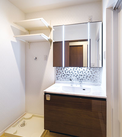 光沢感のあるモザイクガラスをミラー下に配置し、きらびやかな空間に。