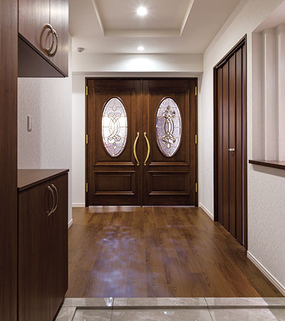 玄関正面には装飾が施された木製輸入扉。ステンドグラスから差し込む光のゆらぎがとても美しい仕様になっています。