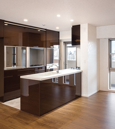 空間が広く感じられるようオープンキッチンとしました。壁面収納も充実させ使い勝手にも配慮しています。