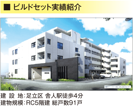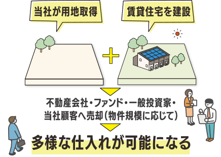ビルドセットとは、土地付き賃貸住宅の販売形態の一種です。こちらは3大都市圏などにおいて、当社が用地を取得し、賃貸住宅の建設を行ったうえで、規模に応じて不動産会社やファンド、一般投資家、当社の顧客に売却するスキームです。