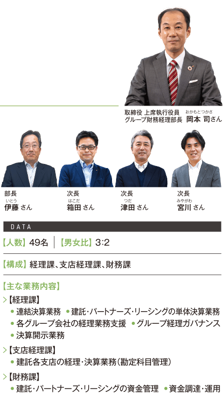 建託グループ各社の経理業務を統括し、ワンチームとしてガバナンス向上に取り組んでいきます。