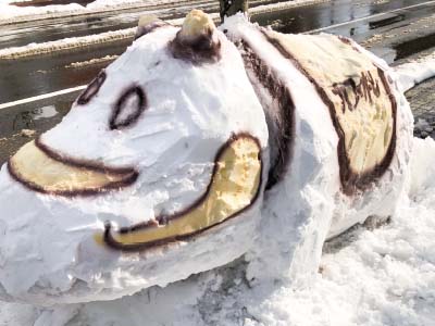 降り積もった雪を用いて会津名物の「赤べこ」の雪像を作成しました。支店正面には多くのギャラリーが集まり、写真撮影などをして地域の方々も楽しまれていました。