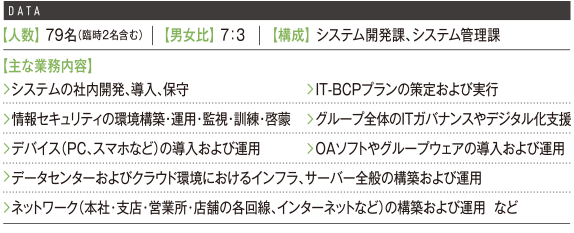 当社のビジネス戦略をITで具現化する「攻め」と、当社ビジネスの安定した継続を支える「守り」両面の役割を担います。