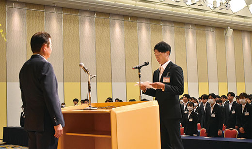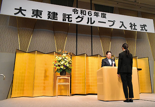 会場中に緊張感が漂うなか、各社の社長から代表者へ辞令が交付され、3社を代表して大東建託社長の竹内さんより祝辞が贈られました。新入社員の姿・表情からは、新社会人としての責任感や将来への希望を感じることができました。