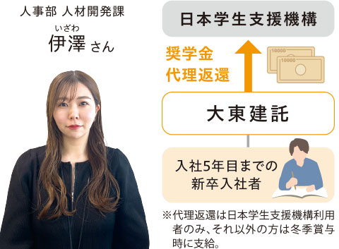 当制度は『若手社員の負担になっている奨学金返済を会社がバックアップする』という制度です。日本の大学生のおよそ50%が利用している奨学金制度。当社の学卒社員においても42%が利用していると回答しています。この制度は、これから入社してくる方だけでなく、既存の社員も対象になります。返済支援により負担が緩和された分、ぜひ自己投資の機会を増やしていただき、大東建託でのキャリア形成につなげてほしい、というのが私たちの願いです。