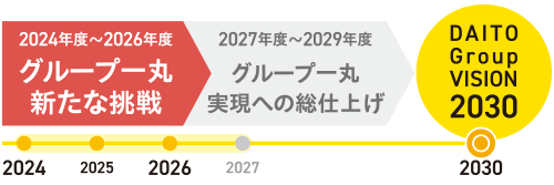 DAITO Group VISION 2030の前半にあたる次期中期経営計画(2024年度~2026年度)では、「グループ一丸新たな挑戦」をスローガンに、 従業員が最大の力を発揮できる環境を整え、盤石なコア事業を創り、新たな取り組みに挑戦していきます。