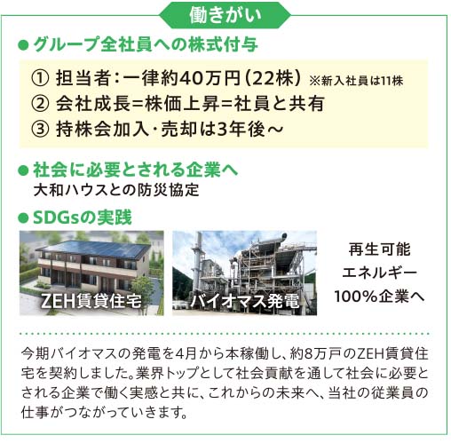 今期からグローバル不動産開発部が発足しました。社内から180名の応募があり、他社での経験者を含め、19名で取り組む買取リノベ再販事業や不動産開発・建物管理は今後世界へも進出し、これまでの「管理戸数№1の大東建託」から今後は「世界からも託される企業」を目指していきます。