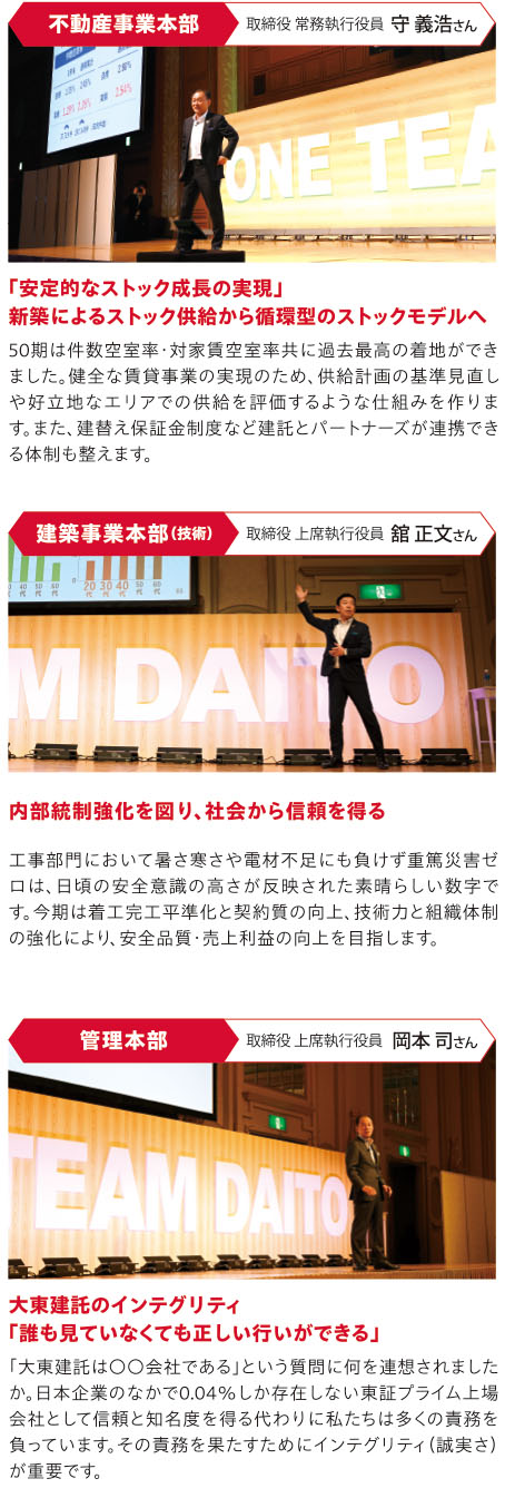 新型コロナ禍前と変わらない高い受注率と入居率を維持し、「VUCA」時代のニーズに沿って従業員も会社も変化が求められています。環境適応業の原点に立ち返り、大東建託グループ全社「ONE TEAM」での協力が必要不可欠です。