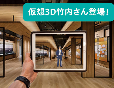 2階展示室では仮想3Dの竹内さんがお客様をお迎えするアイデアも盛り込まれています。