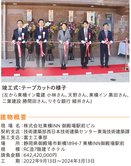 駅前徒歩1分の好立地! 東横INN様がかねてより希望されていた御殿場エリアへの出店について、大東建託が民間入札事業により躯体・外装・外構を手掛けたホテルが去る3月31日に竣工しました。