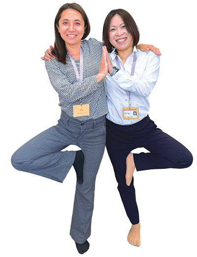 長野支店のYogini※ 下田さんは元インストラクター! 鍛えるところはインナーマッスルと精神! 体を隅々まで伸ばして一段と仕事に磨きをかけますよ~。2人で木のポーズ。fufufu♪!※ヨギーニ:ヨガをする女性のこと