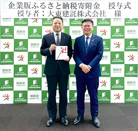当社は、地方創生応援税制(企業版ふるさと納税)を活用し、当社の朝来バイオマス発電所所在地である兵庫県朝来市と、国産材利活用に向けた協業を継続してきた岩手県住田町へ、それぞれ5,000万円、総額1億円を寄付しました。