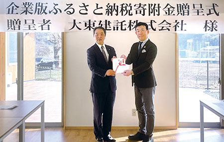 これを受け、3月27日に兵庫県朝来市役所、3月28日に寄附先事業でもある岩手県住田町の仕事と学び複合施設「イコウェルすみた」にて寄附金受納式を行いました。