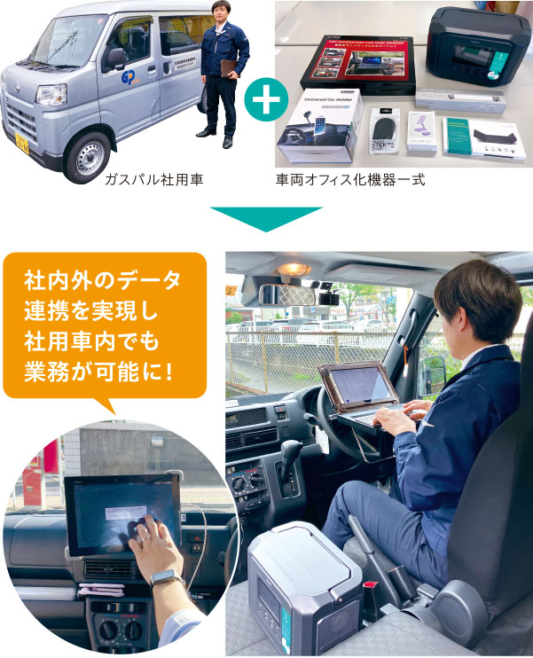 現在、「社用車をオフィスのように使う」取り組みを行っています。販売員はお客様のお宅へ訪問した後、事務所に戻らなくても、車のなかで仕事ができるようになります。これは、長距離の移動時間を有効に活用するための工夫です。