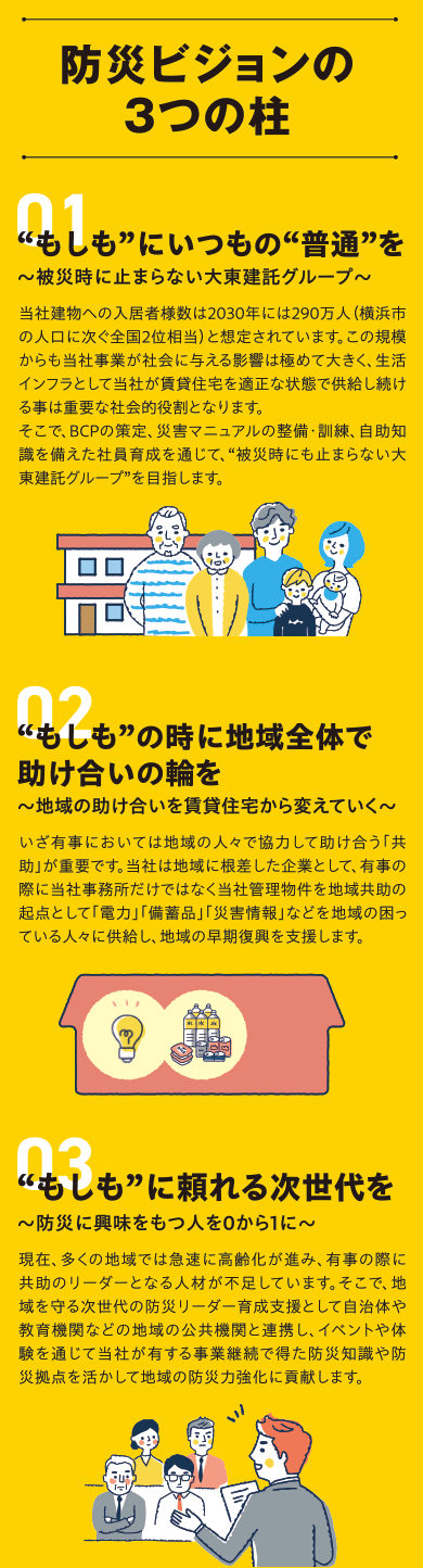 当社と大和ハウスグループとの防災協定締結は、日々の営業活動でライバルとして競い合う会社同士が手を組むという決断で、社内外を含めて関係各所に非常に大きな関心とインパクトを与え、業界全体の防災対応に一石を投じる大きなニュースとなりました。私たちが災害時に最優先すべきことは“競争”ではなく“協同”であり、力をあわせて地域の早期復興に尽力することは防災理念『地域の“もしも”に寄り添う』に則った行動になります。