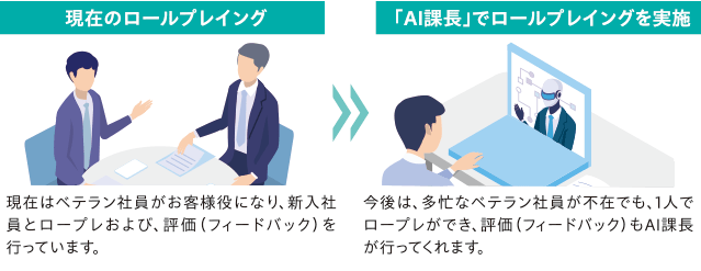 まずは第1弾としてAIによるロールプレイング※機能を公開予定です。日々、上司や先輩社員と行っているロールプレイングをAIが実施・評価する、当社オリジナルの機能です。