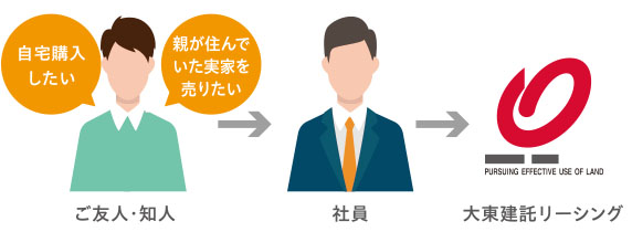 不動産に関して「売りたい」「買いたい」の情報を提供いただき、大東建託リーシングが仲介して成約した場合、紹介料をお支払いします。