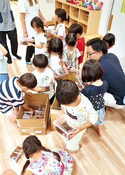 人が入れる大きな虫かごでは、ヘラクレスオオカブトや、ギラファノコギリクワガタなどの世界の珍しい昆虫と触れ合えたり、幼虫掘り体験やさなぎの観察など普段見ることのできないカブトムシ・クワガタにお子様も親御様も大喜びでした。イベントはとても好評で、イベントの3日間の来場者数は合計500名を超えました。また、地域貢献の一環として、近隣の保育園17園にカブトムシ・クワガタを寄贈しました。