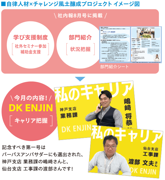 今月号では、社内報8月号で紹介した「学び支援制度」と「部門紹介」に続く、キャリア支援プロジェクト「DK ENJIN」についてご紹介します。