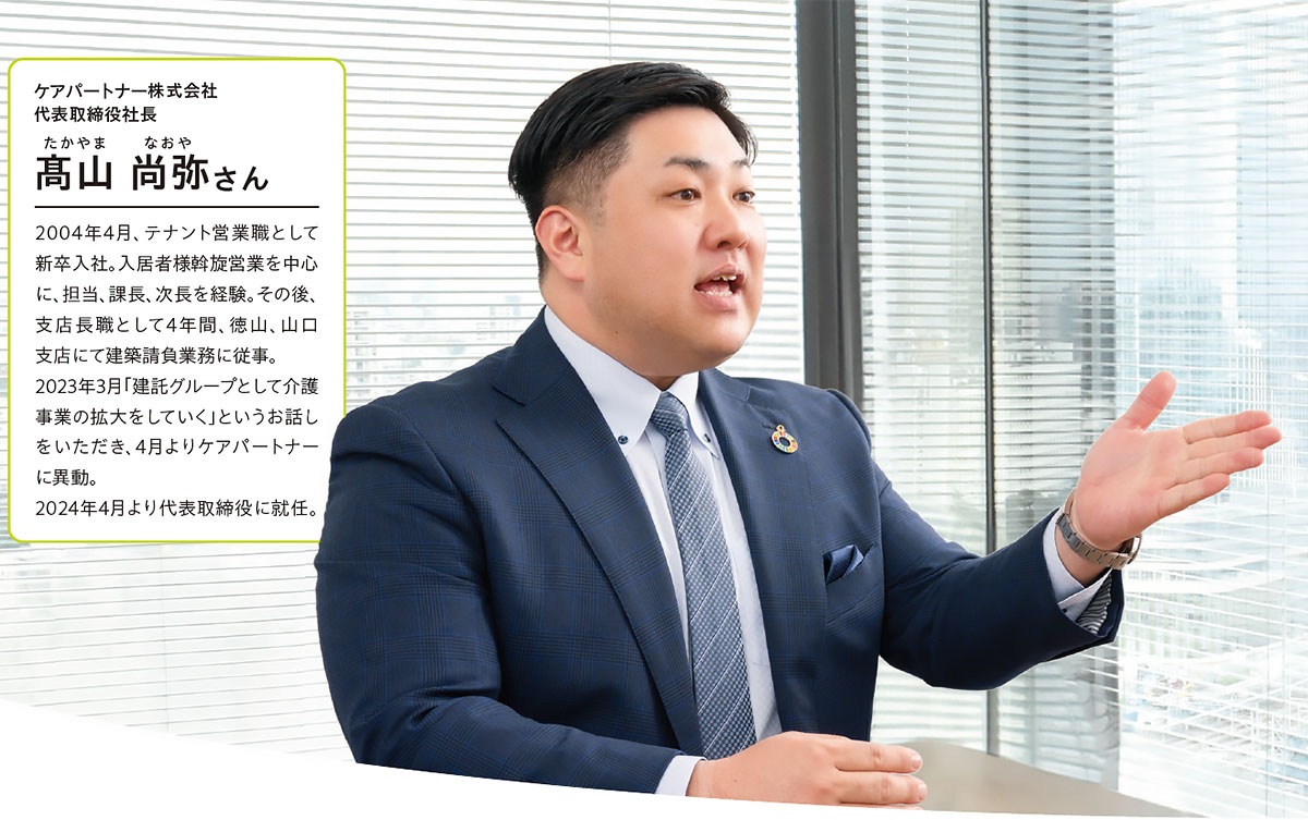 私たち大東建託グループが目指すまちづくりとはいったいどういうものなのか、そのなかでケアパートナーが果たす役割について、ケアパートナー代表取締役社長の髙山 尚弥さんにお話しをうかがいました。