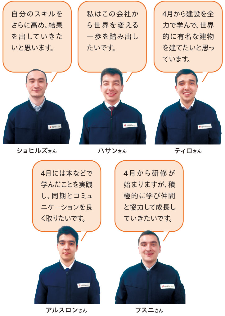 9月に約800人から選考した29名の採用面接を行い、選抜された精鋭5名です。国内従業員と同様の雇用条件で、2025年4月より日本人新規学卒入社社員と共に研修を受け、都内の工事部門に施工管理職として配属予定です。