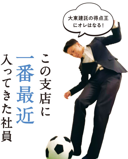 2/1に入社した平松さんです。22歳の若さと溢れるガッツで毎日真剣に取り組んでいます。コミュニケーション力も高く、積極的に質問している姿は先輩社員に愛されるキャラクターです。学生時代はサッカー少年で、大東建託での得点王を目指します!