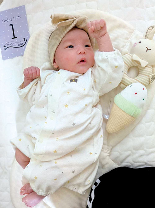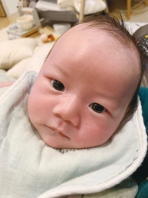 生後1カ月の写真です。誕生したのが2月1日でしたが、私が病院(広島)に駆けつけて、26時間後に生まれてくれました。第一子、初孫なので、今後の成長を楽しみにしています。