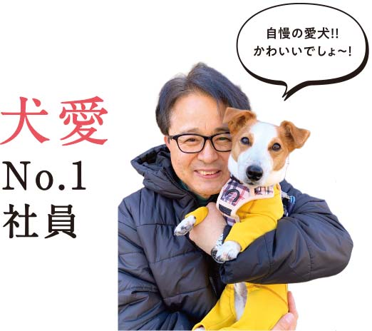仙台支店の犬愛No.1社員、川名智志さん。愛犬との散歩が趣味で癒される休日を満喫しています。社員にも優しく接し、笑顔にする存在。ワンちゃんへの情熱が輝いています。