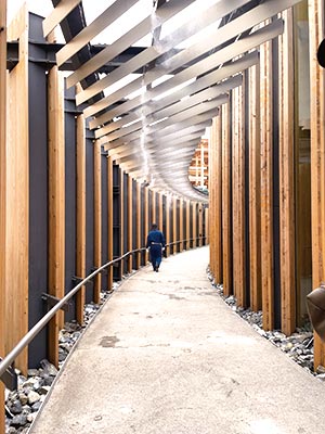 建築プロデューサーは建築界のノーベル賞と言われるプリツカー賞を受賞された坂 茂(ばん しげる)氏で、カーボンファイバーを主構造に紙管や竹の集成材をマテリアルとして使用、基礎部分はコンクリートではなく仮設用鉄骨を使用するなど、徹底的に産業廃棄物が発生しない設計に坂さんのこだわりを感じます。