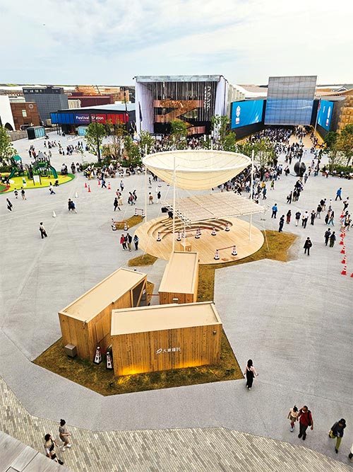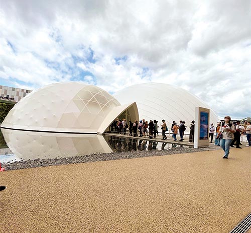当社が資材提供しているポップアップステージは、夢洲駅を出てすぐの東ゲートを入って、木の大屋根リングを潜ったすぐの場所という絶好のロケーション。「雲」をモチーフにした白い半球状のオブジェが目を引くステージで、ウッドデッキとステージ横の控室・倉庫として3棟のキャビンを当社が提供しています。