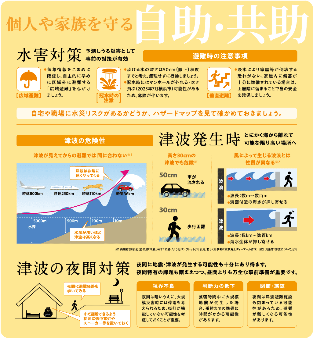 小関さん:被災された際、まず最優先に考えることが「人命」であることは言うまでもありません。まず、命を守ることを最優先とし、守った命を永らえることが大切です。この場合に必要な考え方が「自助(ひとりひとりが自ら取り組むこと)」と「共助(地域や身近な人々で助け合うこと)」です。