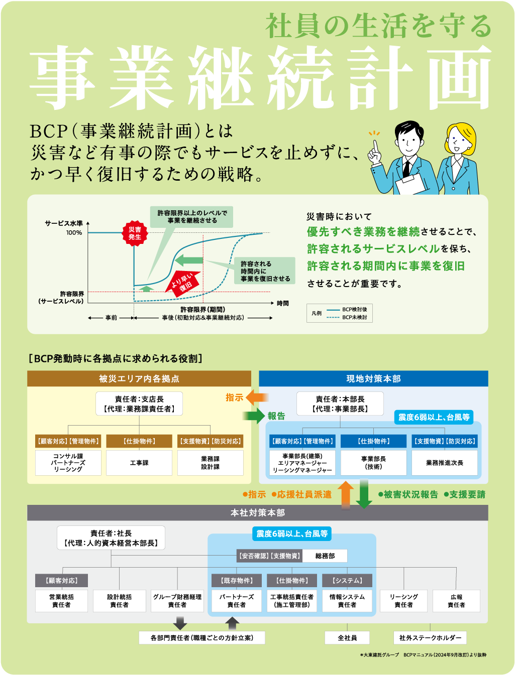 仲宗根さん:私はまだ入社前だったのですが、東日本大震災の時、当社では被災した社員にも固定給の満額支給が保証されたと聞きました。社員にとって心強い出来事だったと思います。いつ・どこで・何が起こっても会社の事業を継続させることが、オーナー様・ご入居者様に対して当社が果たすべき責任であると同時に、我々社員の生活の安定につながるんだと感じました。