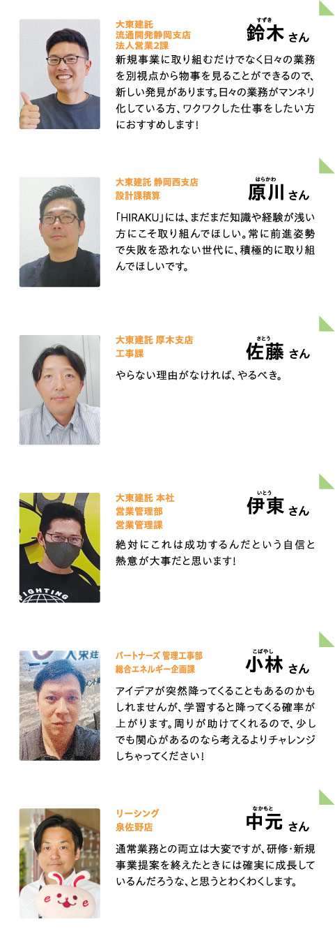 『HIRAKU』は、そんな大東建託グループの全社員に開かれた、未来を切り開く「挑戦の場」であり「成長の場」です。