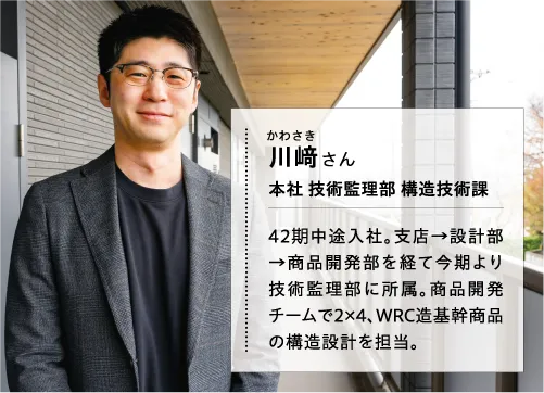 私は開発の企画当初の構造担当に携わっていたこともあり、基幹商品化と実物件を並行して進める異例の流れのなかで実物件の方の構造を担当しました。開発担当から引き継いだ時には、実際に納まっていない接合部分があったりして、そこを調整していくのが本当に苦労しましたね。構造担当は建て方が終わるとあまり現場に行かなくなりがちですが、今回は最後まで現場に行くことになりました(笑)。