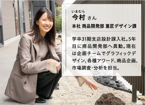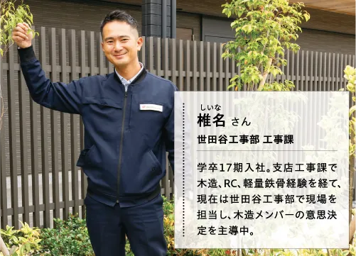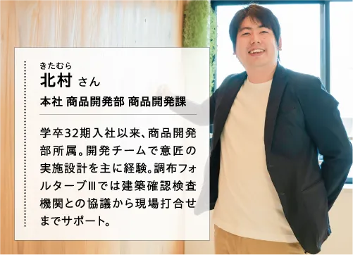 35期入社から商品開発部一筋。フォルターブⅢ開発では木現しのプランを考案。現在はデザイン、高級賃貸など特注対応力を強化中。