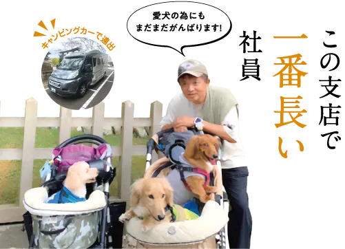 つくば支店の「精神的支柱」として、皆が頼りにしている大ベテラン。実績確保はもちろん、色んな事で頼りにしてます。休日はキャンピングカーで遠出したり、愛犬と遊んでリフレッシュしてます!